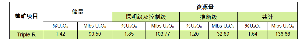 Triple R鈾礦礦體展布示意圖 Fission公司于2018年6月完成當(dāng)年冬季勘探工作。本次冬季勘探工鉆井36口,完成6947米鉆探工作量,本次勘探成果包括: (A) 使R780地段部分推斷級(jí)資源量轉(zhuǎn)化為控制級(jí)資源量,為項(xiàng)目預(yù)可研報(bào)告做準(zhǔn)備; (B) 擴(kuò)大1515W地段的礦體規(guī)模; (C) 采集礦區(qū)的工程地質(zhì)條件樣品。 目前Fission公司已經(jīng)開展夏季勘探工作,總計(jì)費(fèi)用預(yù)計(jì)640萬(wàn)加元,總計(jì)147口鉆井(3425m)的鉆探工作量,進(jìn)一步升級(jí)重點(diǎn)礦化區(qū)R780E的資源量級(jí)別,聚焦?fàn)幦∧甑浊巴瓿深A(yù)可研報(bào)告。 Fission 公司旗下項(xiàng)目資源量